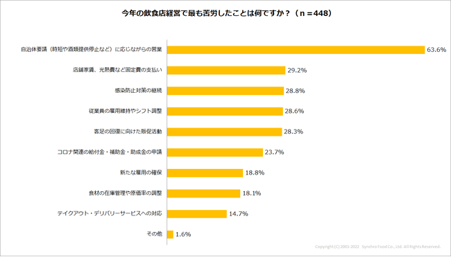 2021年の飲食店経営で最も苦労したことについては、各地で緊急事態宣言やまん延防止等重点措置などが適用されていたこともあり、時短や酒類提供停止といった「自治体要請に応じながらの営業(63.6%)」が最多となりました。さらに、「店舗家賃、光熱費など固定費の支払い(29.2%)」、「感染防止対策の継続(28.8%)」、「従業員の雇用維持やシフト調整(28.6%)」、「客足の回復に向けた販促活動(28.3%)」も共に3割近くの回答があり、コロナ禍での飲食店経営に対する苦労が垣間見える結果となりました。