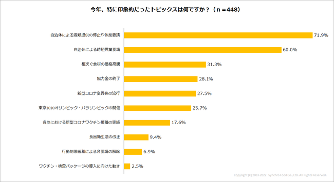 次に、2021年に特に印象的だったトピックスを聞いたところ、最も多かったのは「自治体による酒類提供の停止や休業要請」との回答で、71.9%。以降、「自治体による時短営業要請(60.0%)」、「相次ぐ食材の価格高騰(31.3%)」、「協力金の終了(28.1%)」が続いており、新型コロナ関連のトピックスが多く上位に入る結果となりました。
