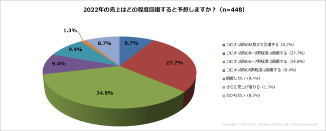 2022年の売上について、どの程度回復するか予想してもらったところ、最も多かったのは「コロナ以前の6~7割程度は回復(34.8%)」との回答。次いで、「8~9割程度は回復(27.7%)」、同率で「5割程度は回復(9.4%)」、「回復しない(9.4%)」との回答が続き、「コロナ以前の状態まで回復する」との回答は8.7%に留まりました。