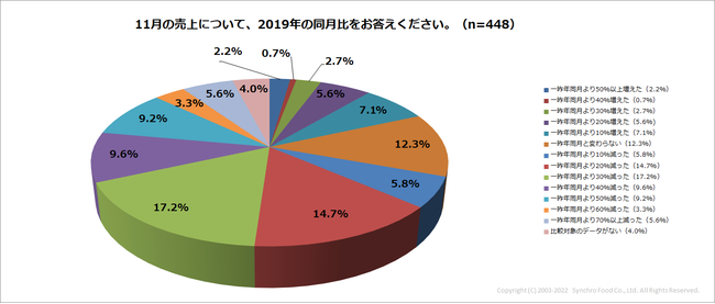 最初に、2021年11月の経営状況について、新型コロナの影響がなかった2019年の同月と比べてもらったところ、最多となったのは「2019年11月より30%減った(17.2%)」との回答。次いで、「20%減った(14.7%)」、「変わらない(12.3%)」と続きました。