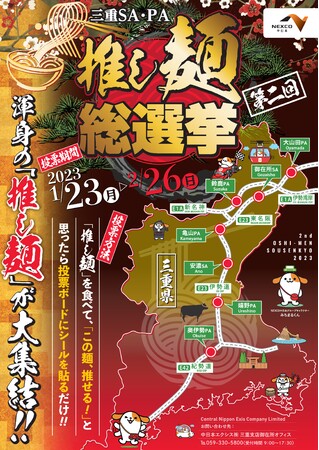 中日本エクシス株式会社 三重支店(三重県四日市市鵜の森、支店長・山本(やまもと)武司(たけし))は、三重県内のサービスエリア(SA)パーキングエリア(PA)の店舗(一部除く)において、昨年度大好評であった、自慢の麺料理を競い合いNo.1を決定する“第2回 三重SA・PA 推し麺総選挙”を開催します。