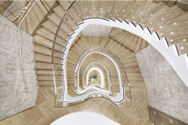 店内の中心には、彫刻的なロッククリスタル素材の手すりが特徴の螺旋階段が設置されています。エルサ・ペレッティの官能的で有機的なフォルムにインスパイアされたこの階段は3階から8階を繋いでおり、各階へはエレベーターでも行くことができます。