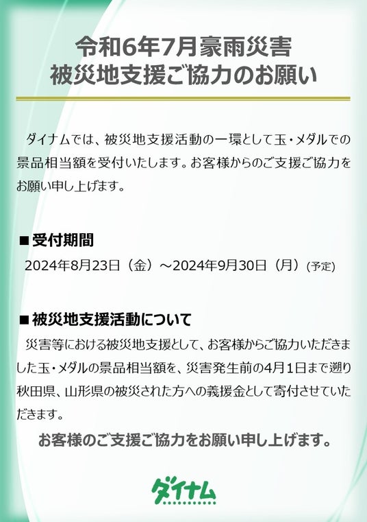 全国46都道府県にパチンコホールを展開する株式会社ダイナム(本社:東京都荒川区西日暮里 代表取締役:保坂 明)は、令和6年7月大雨災害により被災された方々を支援するため、8月23日(金)から9月30日(月)の期間、ダイナム店舗で玉・メダルによる義援金の受付を実施いたします。