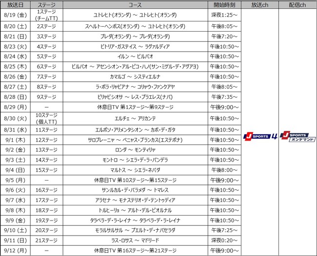 国内最大4チャンネルのスポーツテレビ局、株式会社ジェイ・スポーツ(本社 東京都江東区、代表取締役社長 長谷 一郎、以下「J SPORTS」 ※1)は、8月19日(金)に開幕するブエルタ・ア・エスパーニャの全21ステージを今年も独占生中継します。また、PC、スマホ、タブレットで見られる 「J SPORTSオンデマンド」※2でも放送同様に全ステージをLIVE配信します。さらに、シーズン最後のグランツールの開幕をより多くのサイクルロードレースファンにお届けするため第1ステージの模様をJ:COM及び一部のケーブルテレビ局※3 、スカパー!にて無料放送、J SPORTSオンデマンドで会員無料LIVE配信※4を行います。また翌日の第2ステージはJ SPORTSサイクルロードレース公式YouTubeチャンネル、ニコニコ生放送で無料LIVE配信します。