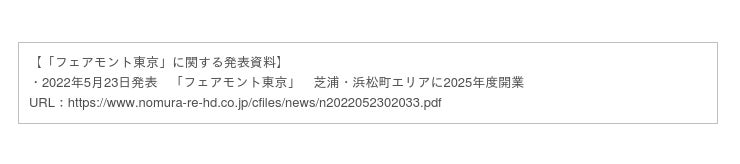 ラグジュアリーホテル「フェアモント」の進出により、国際都市・東京のさらなる賑わい創出と国際競争力の向上を目指してまいります。