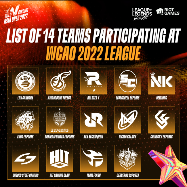 Wild Circuit Asia Open 2022には、14チームが参加する予定です。これらのチームは、3つの地域の公開予選で招待された、または予選を通過したチームです。