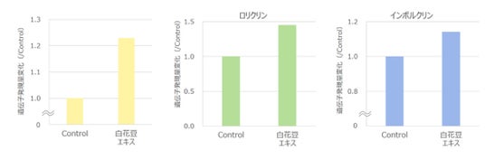 表皮のバリア機能に関わる3つの遺伝子について発現量の変化を確認しました。トリセルリンは、表皮の上層にあって細胞間の隙間を閉じ、異物の侵入や水分の喪失を防ぐもの、ロリクリン・インボクリンは共に、角層を丈夫にし、外部刺激や乾燥から皮膚を守る働きがあります。白花豆エキスはこれらの働きをより活性化させることが示唆されました。