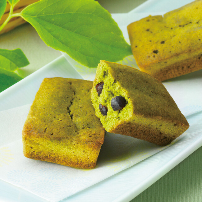 抹茶の香りと焦がしバターの風味が調和した、香り豊かなフィナンシェです。抹茶と相性の良いふっくらとした小豆の甘納豆を加え、しっとりと焼き上げました。抹茶の程よい渋みと小豆のさりげなくやさしい甘さが口の中に広がります。