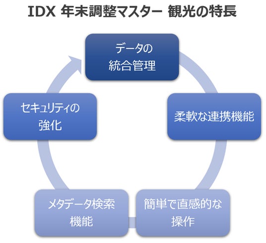 こうした課題を背景に、効率的で正確な年末調整を支援する「IDX 年末調整マスター 観光」が求められています。データの統合管理やリアルタイム更新、セキュリティ強化機能を備え、観光業界特有の複雑な年末調整業務を大幅に簡素化します。