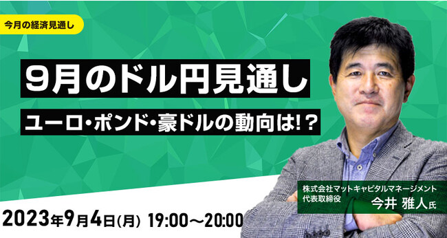 株式会社外為どっとコム(本社:東京都港区、代表取締役社長:竹内 淳)は、9月4日(月)19時より、当社主催の無料オンラインセミナー『9月のドル/円見通し ユーロ、ポンド、豪ドルの動向は!?』を開催することとなりましたので、お知らせいたします。