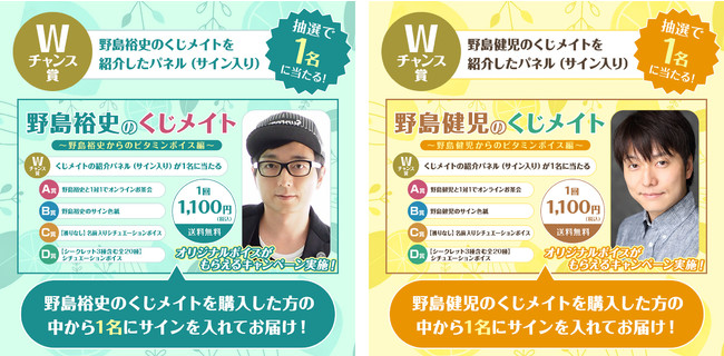 Wチャンス賞として、野島裕史さん、野島健児さんそれぞれのくじメイトを購入した人の中から抽選で各1名に、くじメイトを紹介したパネル(サイン入り)も用意しております。