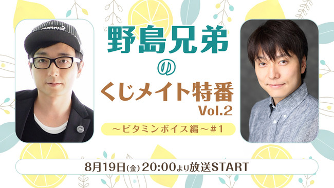 8月19日(金)放送の「野島兄弟のくじメイト特番Vol.2~ビタミンボイス編~#1」は、アニメイトのオンラインくじサービス「くじメイト」において、野島裕史さん、野島健児さんそれぞれのくじメイトが8月12日(金)より販売開始となったことを記念して行われる特別番組です。