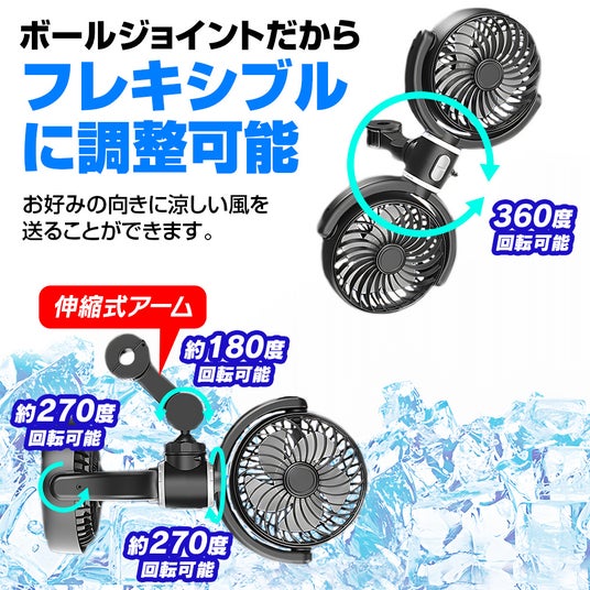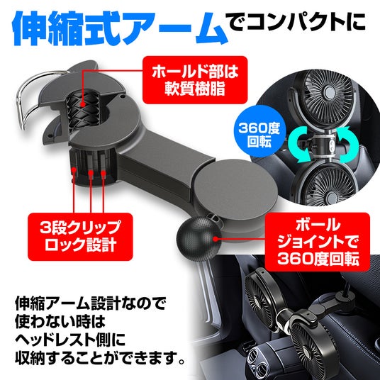 USB電源でヘッドレストにワンタッチ取り付けが可能で上下左右に360°好きな向きに調整できる2025年最新版扇風機!