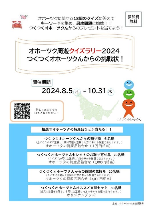 オホーツク管内18市町村の魅力を知ってもらうため、地元住民や観光客に向けて、管内の周遊及び消費喚起を行い、地域経済の活性化を促進するとともに、SNSへの写真投稿を呼びかけ、オホーツク地域の認知度向上を図ることを目的として、次のとおり「オホーツク周遊クイズラリー2024~つくつくオホーツクんからの挑戦状!」を実施しますので、お知らせします。