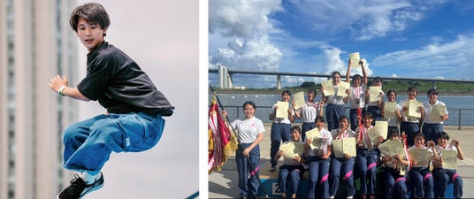▲左から、宮下楓(スラックライン)、武庫川女子大学カヌー部(カヌー)