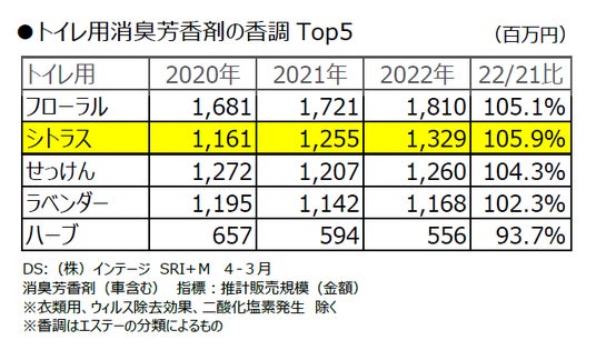 トイレ用消臭芳香剤の人気の香調のトップ5は、「フローラル」「シトラス」「せっけん」「ラベンダー」「ハーブ」の順となっています。2位の「シトラス」は、2022年には前年比105.9%(下図)と一番の伸びを記録しています。