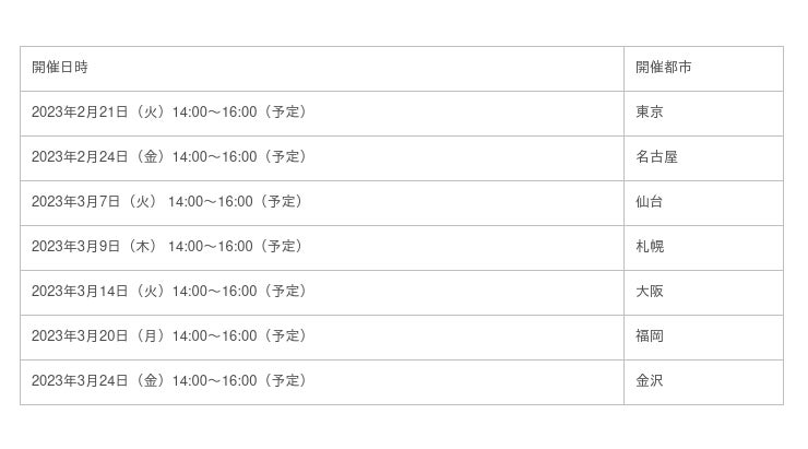 (※1)イベント開催日時・開催場所は予告なく変更になる場合がございます。最新の情報は上記URLよりご確認ください。