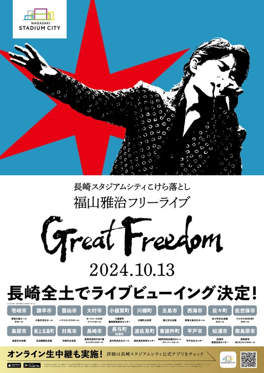 長崎県内の自治体や地元経済団体・観光協会などの皆様にご協力をいただき、県内全域20か所で「Great Freedom」のライブビューイングの開催が決定いたしました。