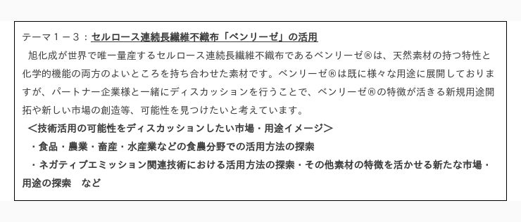 旭化成の技術を活用できる新たな原料の探索や、その原料を旭化成の技術によって加工した素材を活用する市場ニーズ、製品ニーズの探索といった、共創パートナーの持つ原料と旭化成の加工技術を活用して、新たな製品、市場の開拓を目指します。