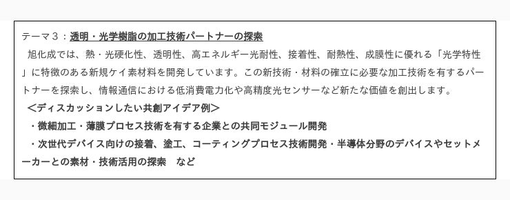 旭化成が開発を進める新規ケイ素材料技術を活用した製品を開発するために、モジュール開発に必要な加工技術(シリコンフォトニクスや光通信分野における微細加工プロセス・技術等)を持つ企業様との共同開発・研究といった共創パートナーの探索を進めます。
