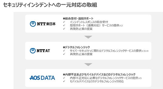 東日本電信電話株式会社(代表取締役社長:澁谷 直樹、以下 「NTT東日本」)、NTTアドバンステクノロジ株式会社(代表取締役社長:伊東 匡、以下 「NTT-AT」)およびAOSデータ株式会社(代表取締役社長:佐々木 隆仁、以下 「AOSデータ」)は、サイバー攻撃や内部不正に対するインシデントレスポンスの一元対応を可能にすることで、地域のお客さまがインシデントの種類に関わらず安心して相談できる環境を提供し、地域社会の被害拡大を防ぐことを目的に、インシデントレスポンス分野での相互協力における連携協定を2024年12月2日に締結します。