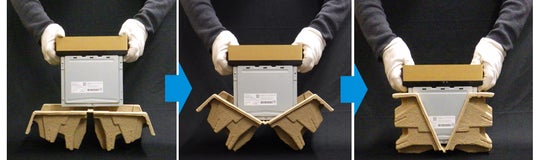 3)V字形状のパルプモールドは製品を置いただけで緩衝材が閉じるため、梱包作業性が向上。(特許出願中)
