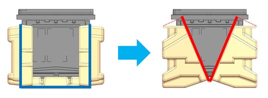 受賞した緩衝材は、従来の発泡スチロール(EPS)から紙(パルプモールド)に素材を変更し、プラスチック包装材の使用量を66%削減、および生産時のCO2排出量を年間約47トン※削減しました。また、類似の緩衝材ではコの字形状のところをV字形状にしたことにより、コスト低減と、製品を置いただけで閉じる機構となり梱包作業性が改善され、生産性の向上を実現しました。