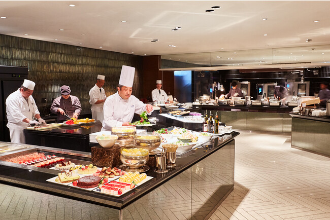 鉄板コーナーではランチタイムに目の前で焼き上げる人気メニューのパリパリチキン、ディナーではシェフおすすめの一品、チーズフォンデュが登場。また、定番の人気メニューの特選ローストビーフ、天ぷらや握り寿司は、ご注文を受けてから目の前で調理しライブ感あふれるパフォーマンスをお楽しみいただけます。