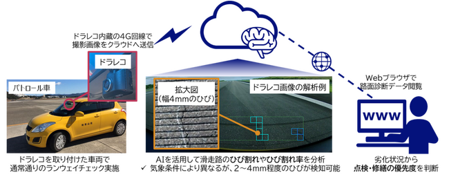 空港において、車両を運転しながら「目視」で実施している滑走路等の日常点検及び巡回点検を「AIによる自動検知」に置き換える取組みです。具体的には、ドライブレコーダー(以下、ドラレコ)を設置した点検車両が、滑走路の点検(車両走行)時に路面の状況(映像)をドラレコに記録し、その画像から学習を重ねたAIがき裂・損傷を自動検知するものです。