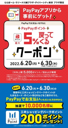 「ららぽーとバーゲン」に先立ち2022年6月20日(月)~6月30日(木)の期間中、 ららぽーと各施設の対象店舗において、PayPayポイント最大5%戻ってくるクーポンなどPayPay支払いでおトクなキャンペーンを実施いたします。