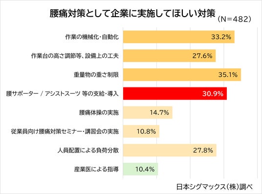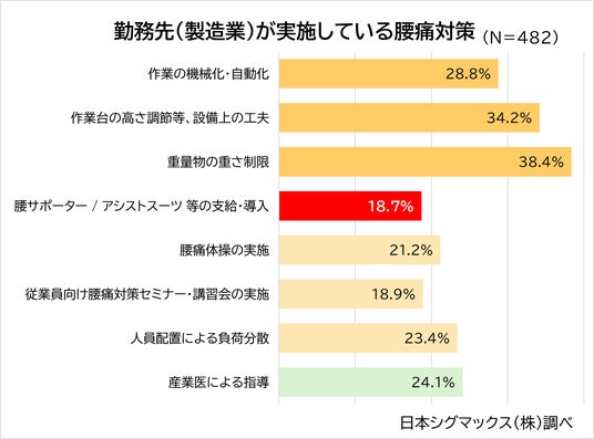 製造業企業では、「重量物の重さ制限(38.4%)」が最も多く腰痛対策実施されており、次いで「作業台の高さ調節等、設備上の工夫(34.2%)」、「作業の機械化・自動化(28.8%)」が挙げられた 一方、従業員が企業側に求める腰痛対策として、上位3番目に「腰サポーター/アシストスーツなどの支給・導入(30.9%)」が回答されていました。