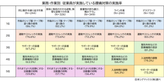 また、腰痛の原因と考える業務・作業別に実施している腰痛対策を分析したところ、同じ対策傾向が見られ、実施率の高い対策としては「市販のシップ薬・テープ剤・塗り薬の使用」が挙げられました。