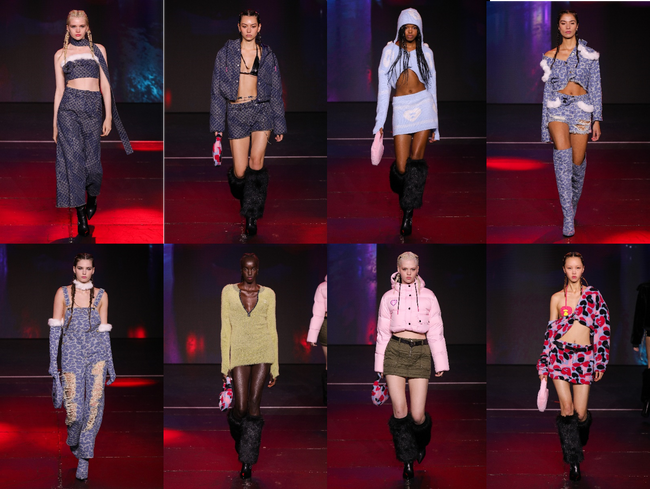 APEEは、日本のギャルのサブカルチャーとZ世代のポップカルチャーからインスピレーションを得た “GEN-Z GYARU WINTER”をテーマとしたコレクションを発表。Y2Kにフォーカスした本コレクションでは、日本のギャルのスタイルをZ世代のファッションへとアップデートしました。クロップド丈のトップスや、ミニスカート、厚底ブーツ、レッグウォーマーがキーアイテムとなり、ハートやワイルドなカモ柄をレトロに解釈した遊び心溢れる雰囲気に仕上げています。APEEのアイコンであるショート丈トップスとフィット感のあるシルエットを打ち出し、甘さとスパイシーさを併せ持つストリートスタイルを提案しています。