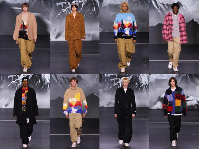 90年代にフィーチャーしたAAPEは、スケートボード、ヒップホップにインスパイアされ、ストリートの原点に立ち返り、ストリートの伝統に重きを置いたコレクションを発表。メンズコレクションでは、90年代のヒップホップにオマージュされたカラフルなスタイルや「MOONFACE MONOGRAM」の総柄をあしらったトラックスーツが登場。ウィメンズコレクションでは、バスケットボールのジャージに着想を得たクロップドセーターや厚手のワイドパンツに加え、ピンクのカモフラージュ柄のダウンジャケットとショーツが登場。また、コレクションのメインとして、アメリカ国旗のパターンをベースにリモデルされたパッチワークパターンを採用。さらに、ブランドアイコンである「AAPER」アーミーを、ぬいぐるみのバックパックや手編みのセーターに落とし込んだ遊び心のあるアイテムがアクセントとなったコレクションです。
