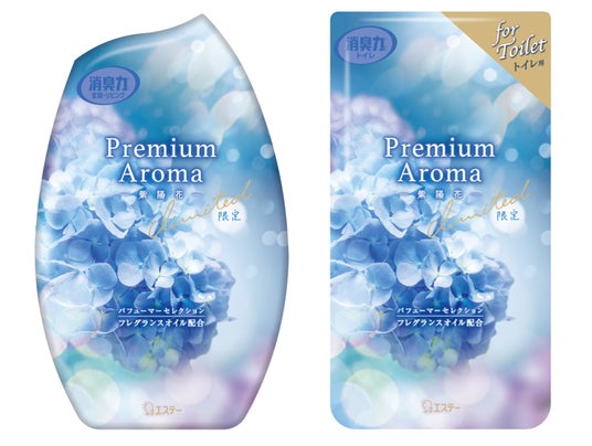 エステー株式会社は、消臭芳香剤「消臭力」のワンランク上の上質な香りをお届けする「消臭力 Premium Aroma(プレミアムアロマ)」シリーズから、雨上がりに繊細にきらめく紫陽花をイメージした透明感ある〈紫陽花〉の香りの「消臭力 Premium Aroma 玄関・リビング用」と「消臭力 Premium Aroma トイレ用」を2024年4月26日から全国のスーパー、ドラッグストア、ホームセンターなどで季節数量限定品として新発売します。