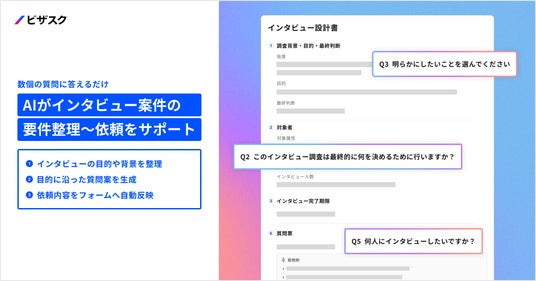 「知見と、挑戦をつなぐ」をミッションにグローバルなナレッジプラットフォームを運営する株式会社ビザスク(以下、当社)は、様々な知見を持つエキスパート(専門家)へのビジネス相談やインタビュー(ヒアリング)において、最適なエキスパートを選定するための要件整理と、実施後の情報整理を支援する2つのAI新機能を提供開始しました。