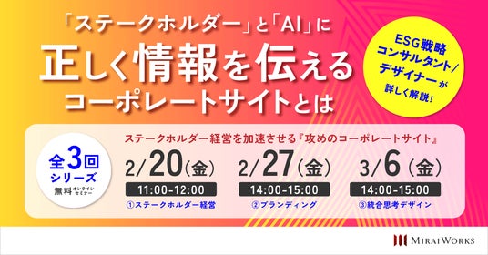 株式会社みらいワークス(本社:東京都港区、代表取締役社長 岡本 祥治)は、2026年2月20日(金)、2月27日(金)、3月6日(金)の、全3回にわたる無料オンラインセミナーを開催いたします。本セミナーでは、コーポレートサイトの診断手法や、成長戦略・サステナビリティを同期させるWeb戦略を解説します。