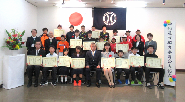 今年度は、教育やスポーツ活動において優秀な成果・成績を収められた18人の個人の方と4団体を表彰し、表彰状と記念品を授与しました。