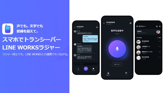 「LINE WORKSラジャー」は、音声AIを活用した、スマートフォン上でトランシーバーのような音声コミュニケーションを実現するアプリです。スマートフォンと専用アプリがあればすぐに使い始めることができ、距離や使用シーンに関係なく、どこでも・いつでもつながります。オフィスなどでは「文字」で、現場では「声」で、といった状況に応じたコミュニケーション方法を柔軟に選択いただけます。