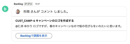 現在Backlogの「あなた宛てのお知らせ」より通知している事項を、Google Chatのダイレクトメッセージより受け取ることができます。