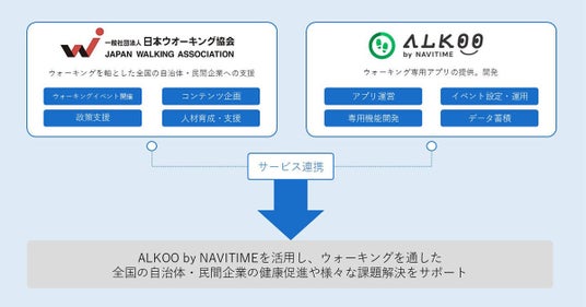 株式会社ナビタイムジャパン(本社:東京都港区、代表取締役社長:大西 啓介)が提供するウォーキングアプリ『ALKOO(あるこう) by NAVITIME』と、一般社団法人日本ウオーキング協会(本社:東京都文京区、代表:畑 浩靖)は、全国の自治体や企業の健康促進策を、共同で推進していくことに合意しました。