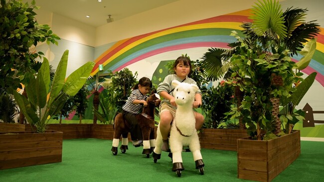 ポニーやアルパカ、キリン・シマウマがお出迎え。かわいい動物に乗って遊べる動物遊具です。虹のかかる森の中を、ペダルをこいで進んでいきます。