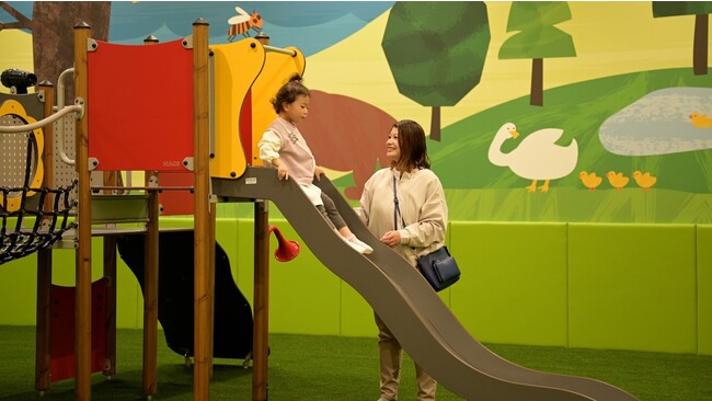 大きなすべり台やトランポリンなど、たくさんの遊具がある広場です。芝生の上を自由に走り回ることができます。小さなお子さま専用のスペースもあるので、安心して遊んでいただけます。