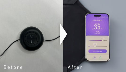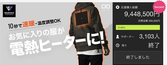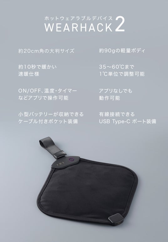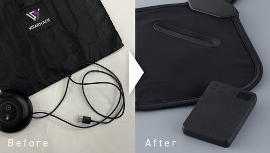 『WEARHACK』シリーズは2022年1月にMakuakeにてクラウドファンディングを実施した製品で、モバイルバッテリーで駆動するヒーターユニットを上着のタグの部分にあるハンガーループに取り付けてヒーターウェア化できる革新的なガジェットです。多くの方に応援いただいき商品化できました。