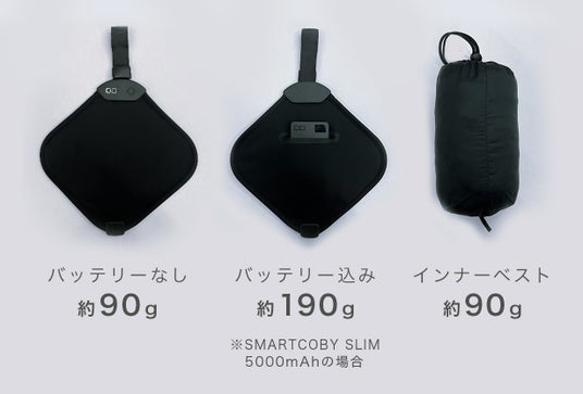 本体重量は約90g。インナーベストと変わらない重さなのに、体積ははるかにコンパクト。5000mAhのSMARTCOBY SLIMとセットでも約190gと軽量です。