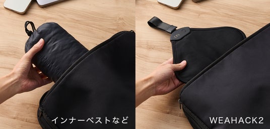 体積がコンパクトかつ薄型設計のため、かさばりがちなインナーベストと違い、ビジネスバックやサコッシュなど薄めのカバンでも楽々収納可能でスマート。