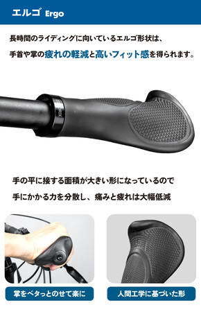 長時間のライディングに向いているエルゴ形状は、手首や掌の疲れの軽減と高いフィット感が期待できます。