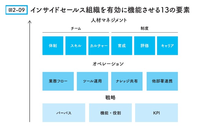 インサイドセールスの組織力を高めるために求められるものは3つのレイヤーが存在します。その上でより細分化した13の要素をわかりやすく解説しています。