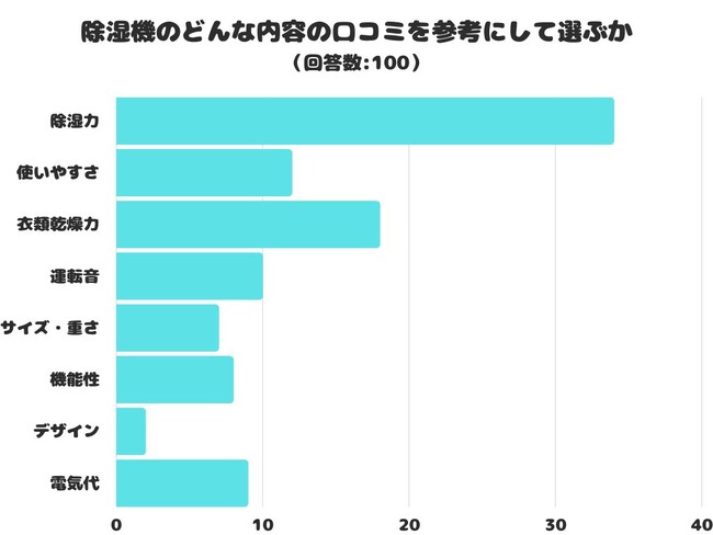 除湿機のどんな内容の口コミを参考にするかをアンケートにて調査したところ、1位は「除湿力」でした。