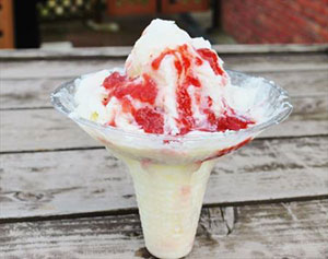 【特 徴】ふわふわな食感で、口に入れるとすぐに融けてしまう新感覚のかき氷です。色鮮やかな夏採りイチゴのソースに心が躍ります。